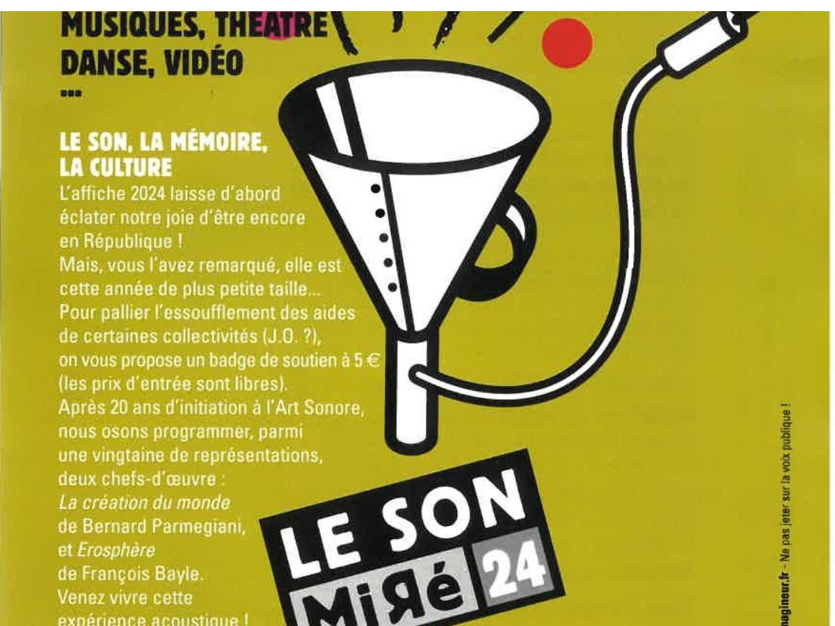 Rendez-vous pour le festival Son Miré ! Festival international du son et de l’acousmatique, au programme : musique, concerts, danse, théâtre, poésie, vidéo, cinéma, photo, installation…